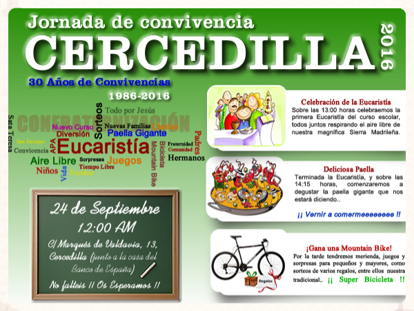 El pasado 30 de Septiembre, celebramos la treinta y…ufff ¡¡¡ muchísimas.. de la Convivencias en Cercedilla, y como cada año, siempre es especial estar con vosotros “Las familias de Jesús Maestro”, los que no han tenido la oportunidad de asistir en todos estos años, no penséis que siempre es lo mismo, como os cuento, cada año es “Especial”, nuevas caras, nuevas familias, nuevos pensamientos… todos juntos formamos esa gran familia que llamamos “APA”.