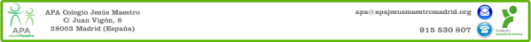 Asociación de Padres de Alumnos (APA) del Colegio Jesús Maestro (en adelante APA, con CIF G-28677334 y domicilio social en calle Melquiades Álvarez, 8– 28003 – MADRID Teléfono: 915 530 807 - Correo electrónico: apa@apajesusmaestromadrid.org